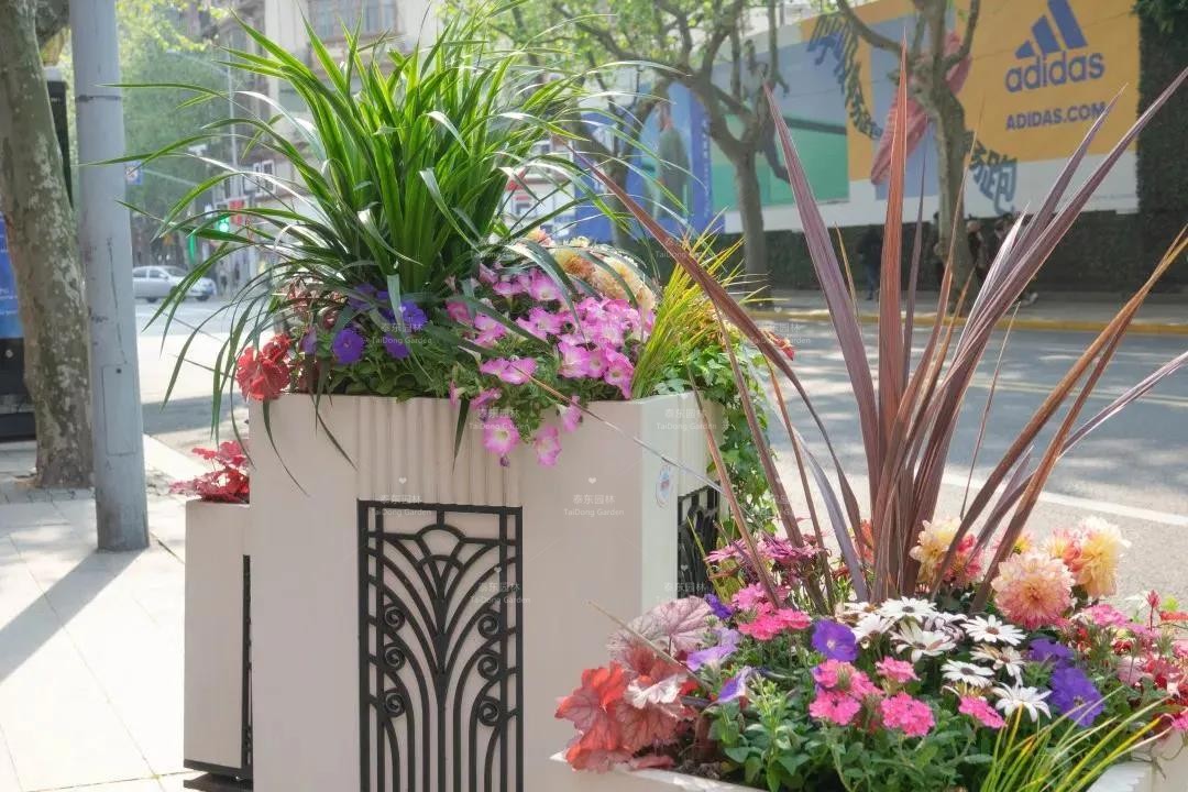 淮海中路花箱選用龍血樹、紅巨人朱蕉、金鉆,搭配小麗花、南非萬壽菊、矮牽牛、礬根、常春藤等,呈現(xiàn)出和諧而繽紛的植物色彩,為繁華時尚的商業(yè)氛圍增添一份清新靚麗的自然美感。