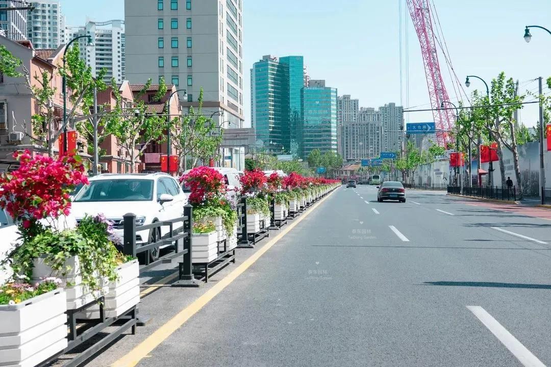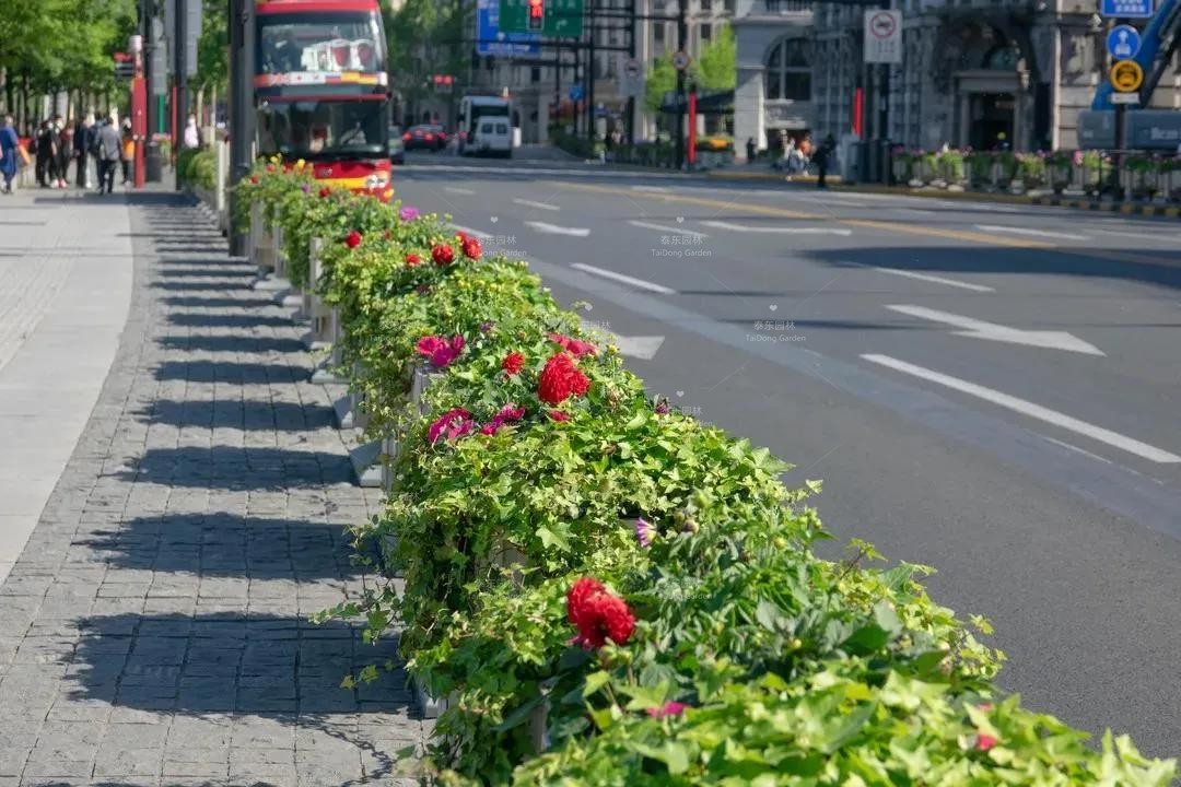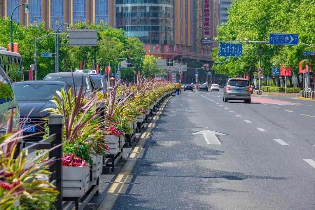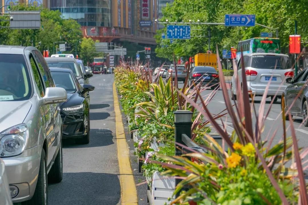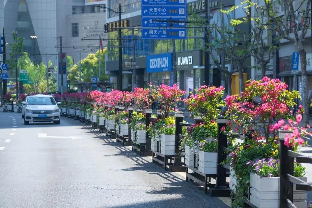 南京西路、西藏南路等道路花箱采用三角梅搭配各色南非萬壽菊、常春藤等,景觀效果靚麗奪目、清新自然。