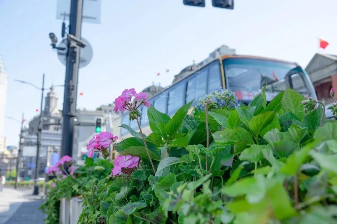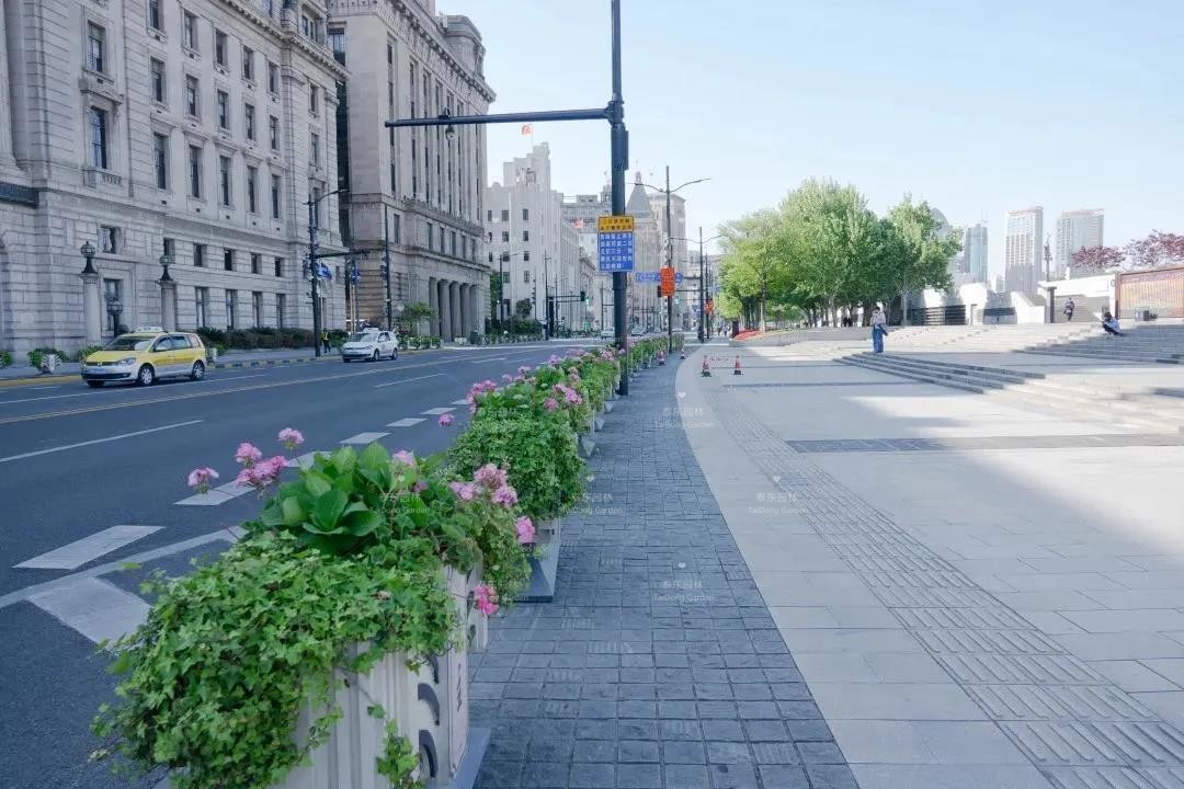 外灘花箱選用紅色及紫色大麗菊,或藍色繡球無盡夏搭配粉色天竺葵?,F(xiàn)大麗菊及繡球花正含苞待放,漸入佳境。